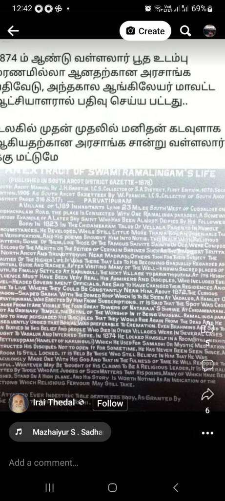 The Abrahamics speak of saints and prophets and god’s sons. Hindu Dharma has its fair share of enlightened men. But the merging of the saint Vallalar who lived in the nineteenth century with the Jyothi has gone down in history – to be recorded to posterity, with proper evidence, during British Raj in India. So that puts Vallalar in an entirely different league.